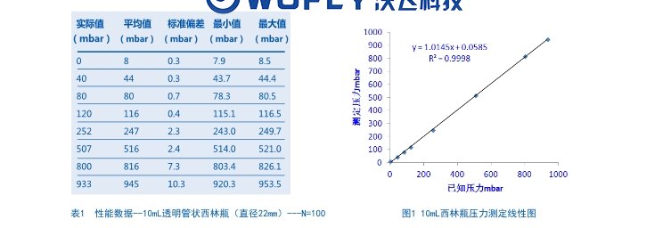 采用填充氮氣壓力為0、40、80、120、253、507、800和933 mbar的一組壓力標(biāo) 準(zhǔn)評估用于測定總頂空壓力的系統(tǒng)性能。通過直徑為22mm的10mL西林瓶建立這些標(biāo) 準(zhǔn)。使用FMS-1400頂空水汽/真空度測試儀測定每種標(biāo)準(zhǔn)100次。FMS-1400頂空水汽/真 空度測試儀測定容器頂空中水蒸氣分子的激光吸收量。吸收信號寬度與氮氣壓力相關(guān)。根 據(jù)測得數(shù)據(jù)確定平均濃度、標(biāo)準(zhǔn)偏差、最大讀數(shù)和最小讀數(shù),這些數(shù)據(jù)如表1所示。圖1所示 為表1中壓力數(shù)據(jù)的線性圖。