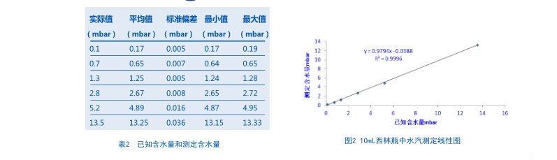使用填充水蒸汽壓力為0.1、0.7、1.3、2.8、5.2、13.5mbar的一組水汽標(biāo)準(zhǔn)物質(zhì)評估用于測定水蒸氣壓力的系統(tǒng)性能。通過直徑為 22mm的10mL西林瓶建立這些標(biāo)準(zhǔn)。使用FMS-1400水汽/真空度測試儀測量每種標(biāo)準(zhǔn)物質(zhì)100次。FMS-1400水汽/真空度測試儀測量容器頂空中水蒸汽分子激光吸收量。吸收信號振幅與頂空水汽汽濃度成比例。根據(jù)測得的數(shù)據(jù)集確定平均濃度、標(biāo)準(zhǔn)偏差、最大讀數(shù)和最小讀數(shù),這些數(shù)據(jù)如表2所示。圖2所示為表2中水分濃度數(shù)據(jù)線性圖。這種測定的無損特性使得我們可以建立系統(tǒng)性能的全面統(tǒng)計文檔。從應(yīng)用的觀點來看,采用無損測量可以在同一個樣品上隨著時間進(jìn)行多次測定(例如在整個貨架期內(nèi)進(jìn)行多次測定),并且進(jìn)行全面的批量分析可幫助客戶深入了解工藝的變化和對應(yīng)的優(yōu)化措施。